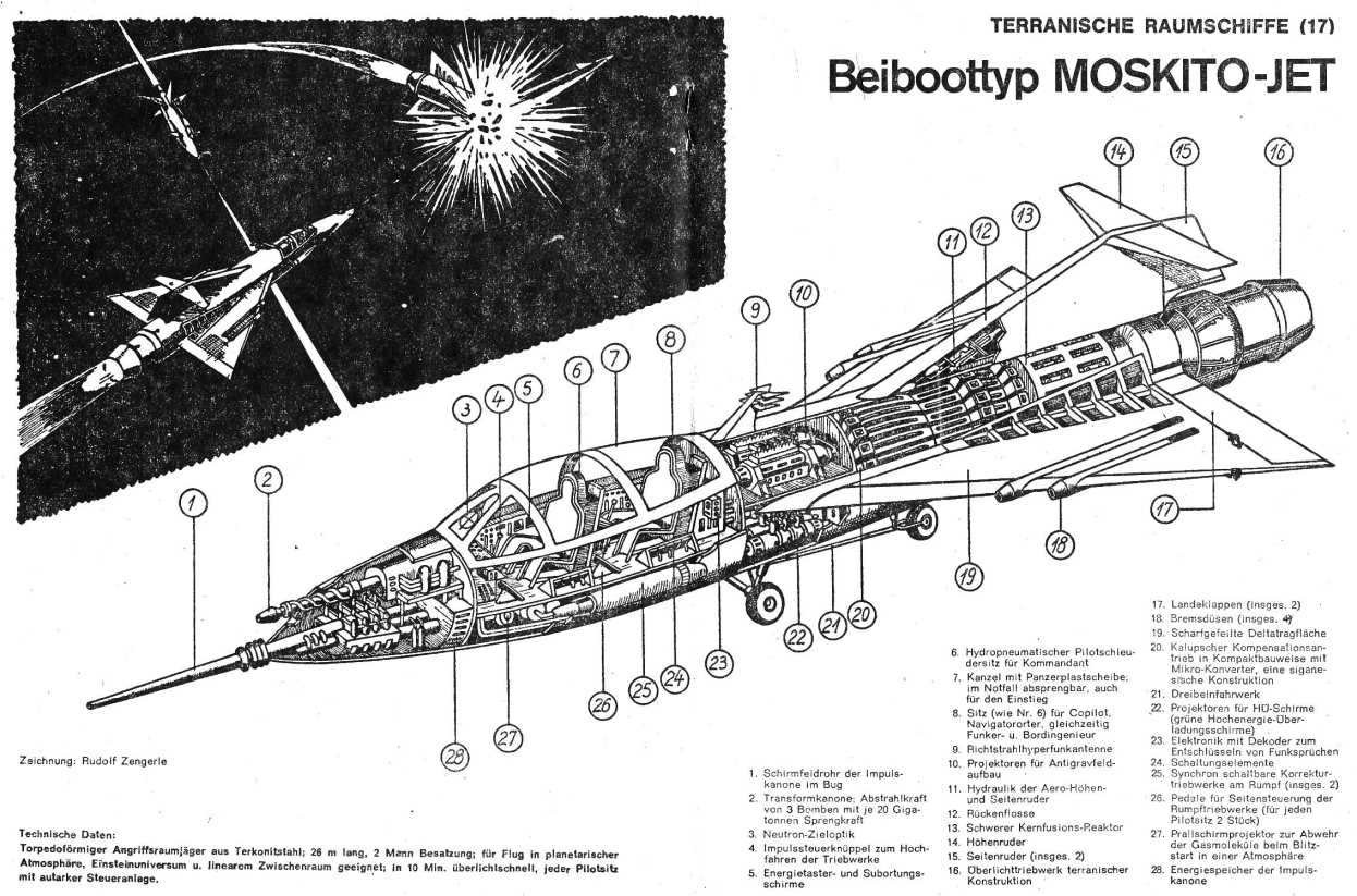 Der Moskito-Jet ist ein hochmoderner Angriffsjäger mit einer Terkonitstahlpanzerung und einer Gesamtlänge von 26 Metern. Der Jet ist für den Flug in Planetenatmosphären, im All und im Zwischenraum geeignet. Um die erforderliche Geschwindigkeit für den Linearflug zu erreichen benötigt die Moskito-Jet nur 10 Minuten