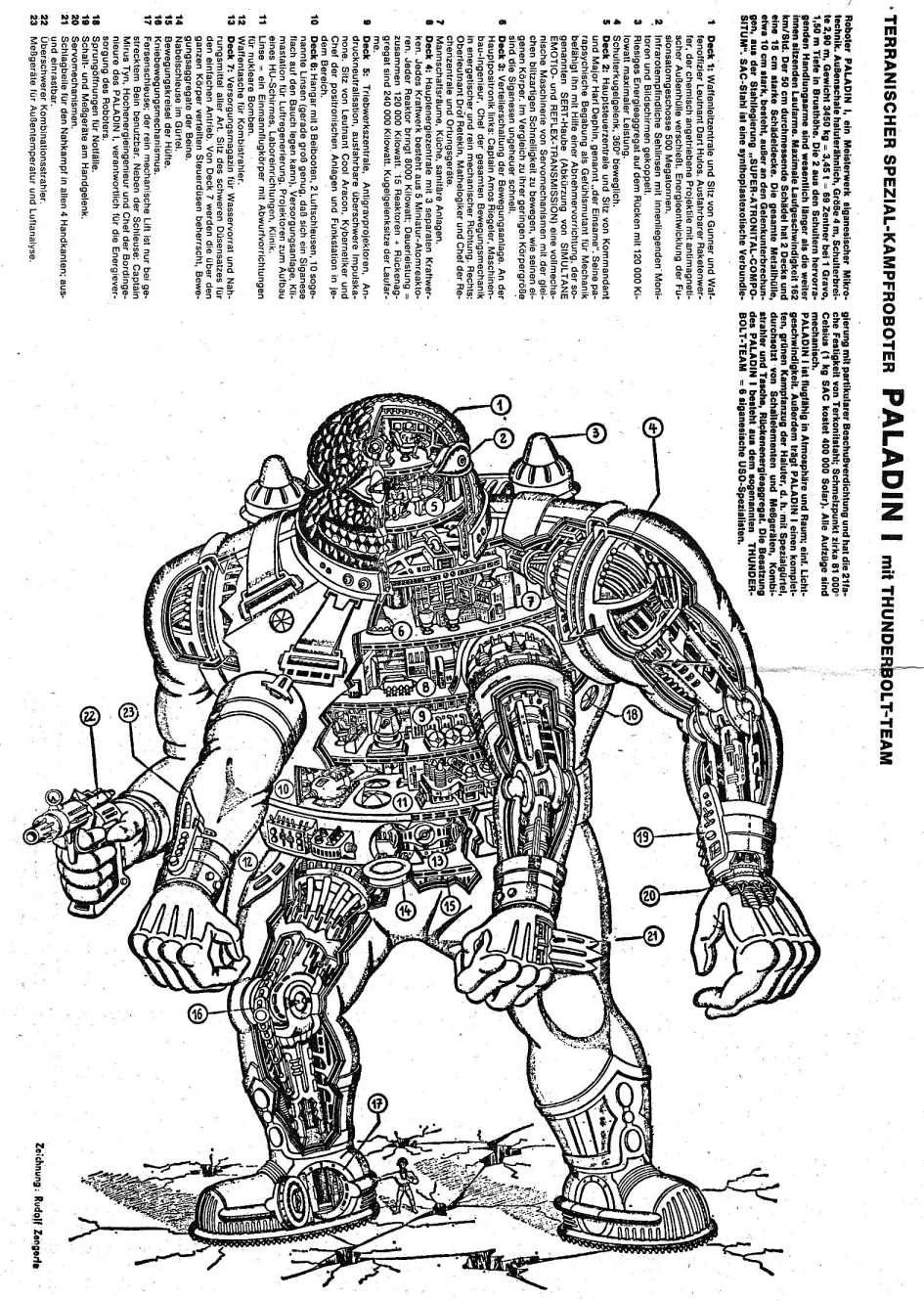 | Deck 1: 1. Waffenleitzentrale und Sitz von Gunner und Waffenoffizier Leutnant Dart Hulos. Ausfahrbarer Raketenwerfer, der chemisch angetriebene Projektile mit antimagnetischen Außenhüllen verschießt. Energieentwicklung der Fusionsgeschosse: 500 Megatonnen 2. Infrarotempfindliche Sehlinsen mit innenliegenden Monitoren und Bildschirmen gekoppelt 3. Riesiges Energieaggregat auf dem Rücken mit 120.000 Kilowatt maximaler Leistung 4. Schulter-Kugelgelenk 360° beweglich Deck 2: Deck 3: Deck 4: |