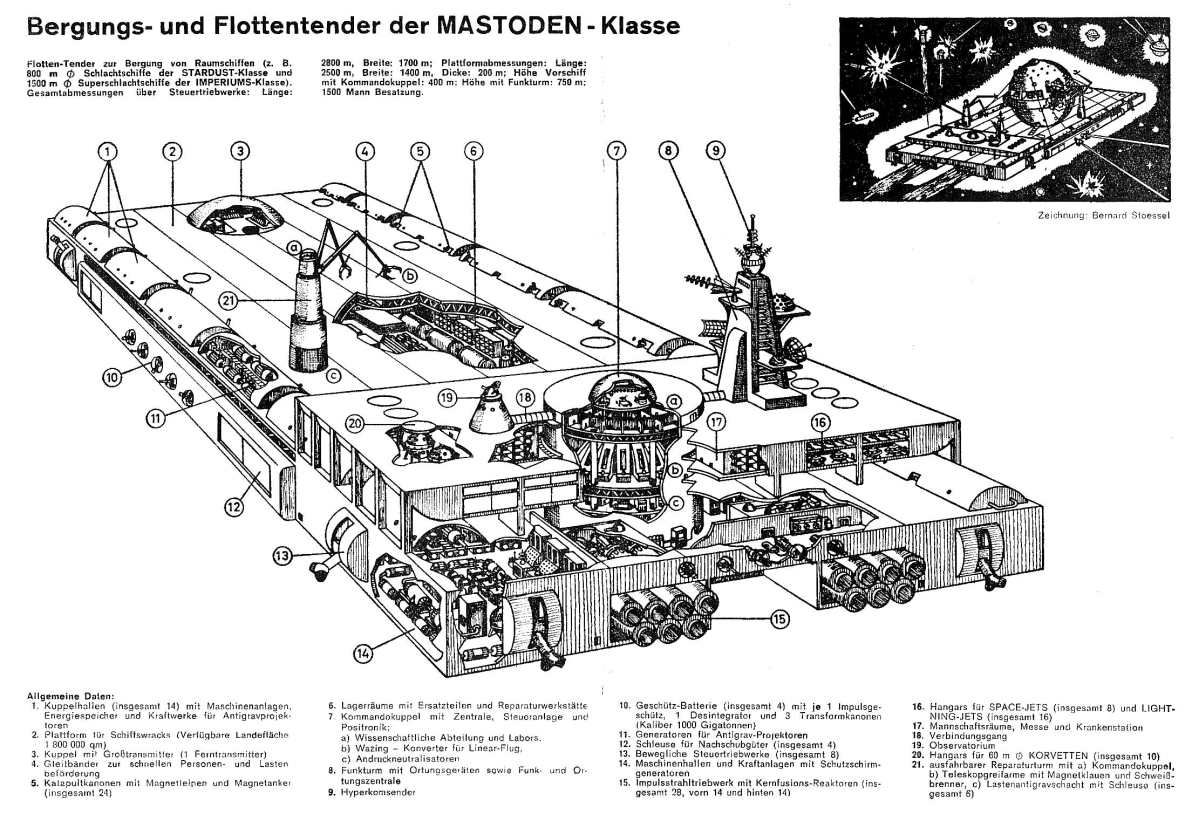 (insgesamt 16) 17. Mannschaftsräume, Messe und Krankenstation 18. Verbindungsgang 19. Observatorium 20. Hangars für 60 m KORVETTEN (insgesamt 10) 21. Ausfahrbarer Reparaturturm mit a) Kommandokuppel, b) Teleskopgreifarme mit Magnetklauen und Schweißbrenner,