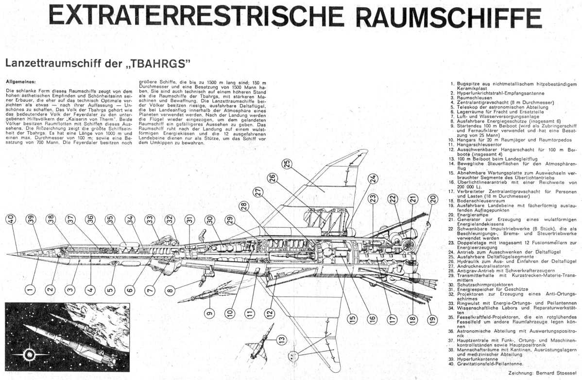 Die schlanke Form dieses Raumschiffs zeugt von dem hohen ästhetischen Empfinden und Schönheitssinn seiner Erbauer, die eher auf das technisch Optimale verzichten als etwas - nach ihrer Auffassung - Unschönes zu schaffen. Das Volk der Tbahrgs gehört wie das bedeutendere Volk der Feyerdaler zu den untergeordneten Hilfsvölkern der "Kaiserin von Therm". Beide Völker besitzen Raumflotten mit Schiffen dieses Aussehens. Die Rißzeichnung zeigt die größte Schiffseinheit der Tbahrgs. Es hat eine Länge von 1000m und einen maximalen Durchmesser von 100m; sowie eine Besatzung von 700 Personen. Die Feyerdaler besitzen noch größere Schiffe, die bis zu 1500m lang sind; 150m Durchmesser und eine Besatzung von 1500 Personen haben. Sie sind auch technisch auf einem höheren Stand als die Tbahrgs, mit stärkeren Maschinen und Bewaffnung. Die Lanzettraumschiffe beider Völker besitzen riesige ausfahrbare Deltaflügel, die bei Landeanflug innerhalb der Atmosphäre eines Planeten verwendet werden. Nach der Landung