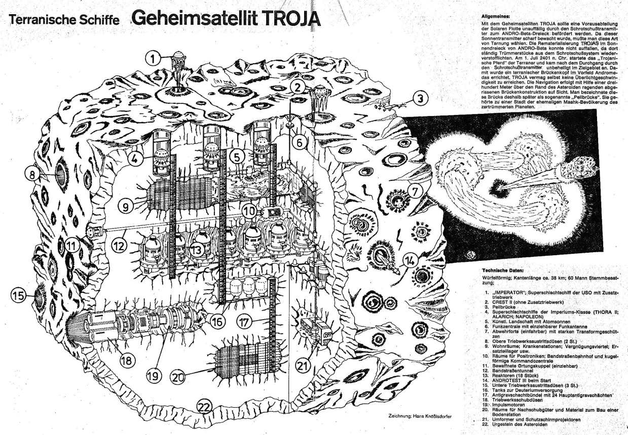 Mit dem Geheimsatelliten TROJA sollte eine Vorausabteilung Solaren Flotte unauffällig durch den Schrotschußtransmitter zum ANDRO-Beta-Dreieck befördert werden. Da dieser Sonnentransmitter scharf bewacht wurde, mußte man diese Art von Tarnung wählen. Die Rematerialisierung TROJAS im Sonnendreieck von ANDRO-Beta konnte nicht auffallen, da dort ständig Trümmerstücke aus dem Schrotschußsystem wiederverstofflichten. Am 1. Juli 2401 n. Chr. startete das "Trojanische Pferd" der Terraner und kam nach dem Durchgang durch den Schrotschußtransmitter unbehelligt im Zielgebiet an. Damit wurde ein terranischer Brückenkopf im Vorfeld Andromedas errichtet. TROJA vermag selbst keine Überlichtgeschwindigkeit zu erreichen. Die Navigation erfolgt mit Hilfe einer dreihundert Meter über den Rand des Asteroiden ragenden abgerissenen Brückenkonstruktion auf Sicht. Man bezeichnete diese Brücke deshalb später als sogenannte "Peilbrücke". Sie gehörte zu einer Stadt der ehemaligen Maahk-Bevölkerung des zertrümmerten Planeten.